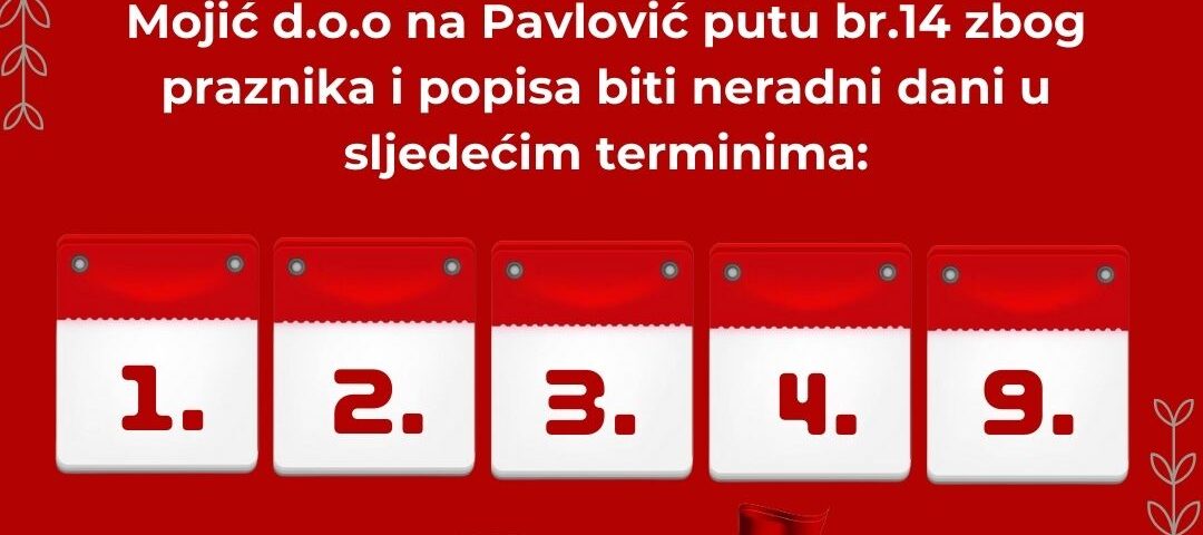 OBAVJEŠTENJENeradni dani:Obavještavamo Vas da će u kompaniji Mojić d.o.o. na Pavlović putu br. 14 zbog praznika i popisa biti neradni dani u sljedećim terminima: